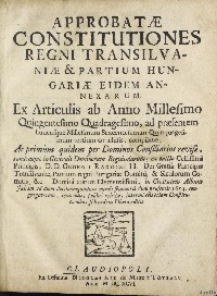 CímApprobatae constitutiones regni Transilvaniae & Partium Hungariae eidem annexarum. Ex articulis ab anno millesimo quingentesimo qudragesimo, ad praesentem huncusque millesimum sexcentesimum quinquagesimum tertium conclusis, compilatae; ac primum quidem per dominos consiliarios revisae, tandemque in generali dominorum regnicolarum, ex edicto celsissimi principis, d. d. Georgii Rakoczi II. Dei dratia principis Transilvaniae, Partium regni Hungariae domini, et siculorum comitis, &c. Domini eorum clementissimi, in civitatem Albam Juliam ad diem decimumquintum mensis Januarii Anni praesentis 1653. congregatorum, conventu, publice relectae, intermixtis etiam constitutionibus sub eadem diaeta editis
