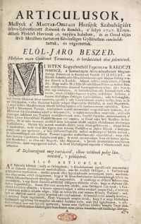 CímArticulusok, mellyek a magyar-orszagi hazájok szabadságáért öszve-szövetkezett státusok és rendek, e folyó 1707. esztendö-béli Pünkösd havának 16. napjára haladott, és az Onod táján lévö mezöben tartatott közönséges gyülésében concludáltattak, és végeztettek : Költ a meg-nevezett Onod táján, Szent-Iván havának huszonkettödik, tudni-illik ezen generalis gyülésünknek utolsó napján, ezer hétszáz hetedik esztendöben